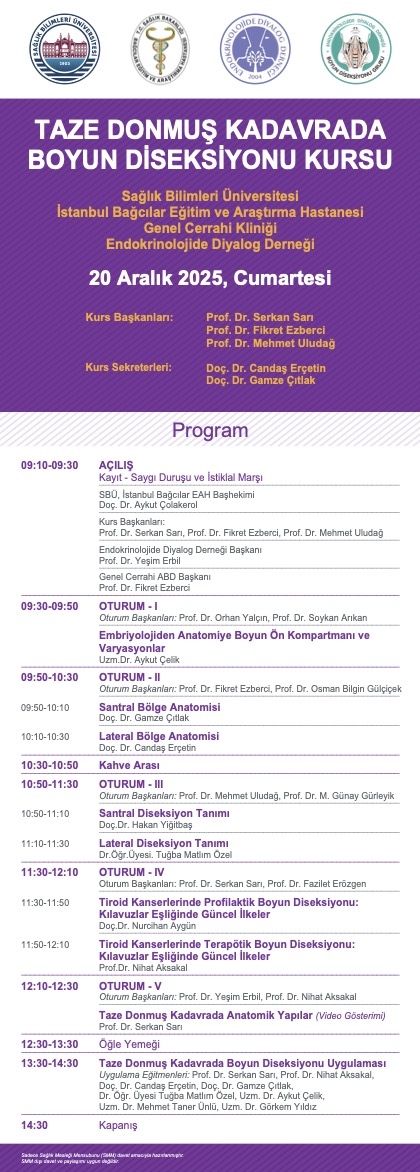 Sağlık Bilimleri Üniversitesi İstanbul Bağcılar Eğitim ve Araştırma Hastanesi Genel Cerrahi Kliniği ve Endokrinolojide Diyalog Derneği işbirliği ile 20.12.2025 tarihinde SBÜ İstanbul Bağcılar Eğitim ve Araştırma Hastanesi ev sahipliğinde “Taze Donmuş Kadavrada Boyun Diseksiyonu Kursu” düzenlenecektir.